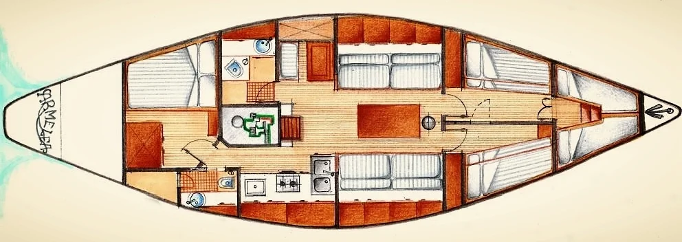 Armelea dispone di 3 cabine doppie (di cui una matrimoniale a poppa e 2 con letti a castello a prua) + una cabina equipaggio (ricavata nella cala-vele a prua), e volendo di altri due letti singoli in dinette (ampia e comoda con tavolo apribile contenitivo) per un totale di 10 posti letto. Ha 2 bagni (di cui uno con doccia). Ampia cucina attrezzata, completa di stoviglie e pentole, con lavandino doppio, 2 fuochi + forno a gas, frigo a pozzetto generoso. Sistema di riscaldamento "Webasto"; a richiesta condizionatore portatile. Ha un'ampia capacità di serbatoi sia di acqua dolce (450 L) che di carburante (360 L), per navigare senza il pensiero costante dell'ormeggio in porto per il rifornimento. Boiler per acqua calda in cucina e nei due bagni. Dotazioni di sicurezza complete e cassetta di pronto soccorso regolamentare per navigazioni senza alcun limite dalla costa.